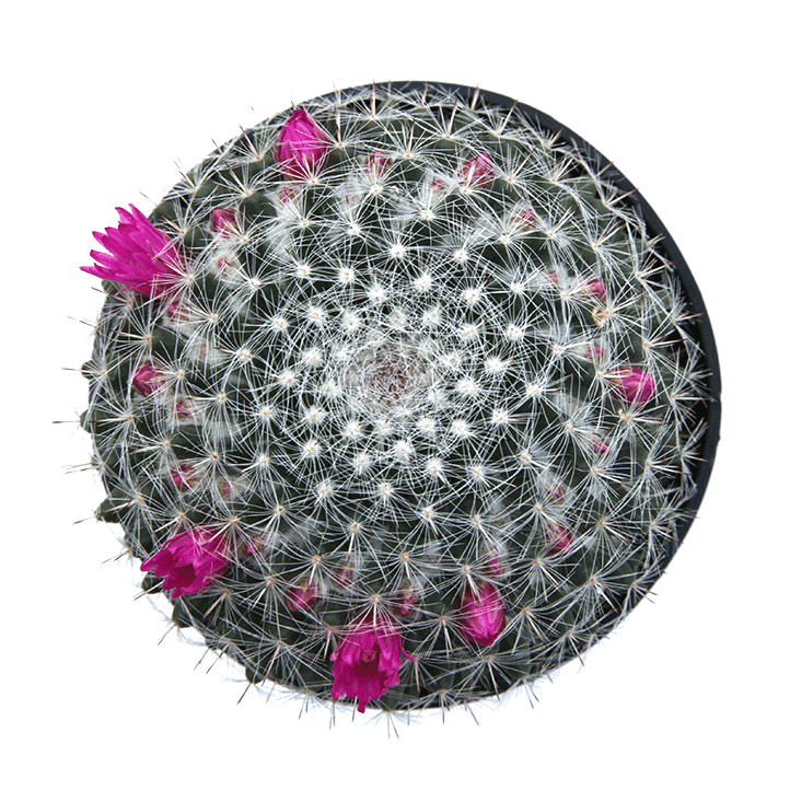 Though often a solitary grower, Mammillaria ‘Old Lady Cactus’ can form clusters of rounded stems that sometimes appear slightly flattened across the top, thus creating a low mound of bluish green color offset by wispy white hairs, light brown spines, and white tufted areoles. Adding yet another layer of impact, during the spring and summer months magenta blooms will tightly ring the upper third of the cactus. Reaching up to 10 inches tall and 20 inches wide at maturity, ‘Old Lady Cactus’ is a slow-grower that will reward consistent, largely hands off care with a long-lived, high impact specimen sure to lend a pop of whimsy to any succulent and cacti collection.