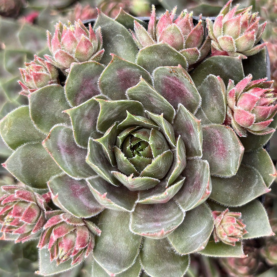 Sempervivum Colorockz® 'Blushing Garnet' is a cold-hardy stunner that delivers year-round color and charm. Its tightly packed rosettes are a rich garnet-red with green undertones, especially vivid in cooler months, and it's surrounded by clusters of blushing pink offsets that resemble miniature flower buds. This eye-catching succulent is perfect for rock gardens, patio containers, and hardy groundcover displays, thriving in full sun and well-drained soil. Like all hens and chicks, it produces pups freely, forming dense, colorful colonies over time. Drought-tolerant and frost-resistant, 'Blushing Garnet' is both tough and ornamental—an ideal choice for low-maintenance landscapes with high-impact appeal.