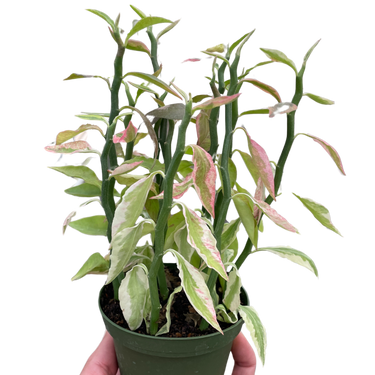 - Description: Delightfully crooked, zig-zag stems give Variegated Devil’s Backbone its wild, rebellious look and playful nickname. Variegation in shades of chartreuse, yellow and cream highlight the edges of the small, pointed leaves, adding extra appeal to its exotic form. In the cooler winter months, the leaf edges can take on a pink hue. This colorful, succulent shrub makes a uniquely sculptural houseplant specimen. Also called Jacob’s Ladder, or Redbird Flower, the plant can develop tiny red flowers on the growing tips in spring, however they often don’t bloom in cultivation. Grow in a well-draining, light potting mix, and avoid extended periods of extreme dryness, which can cause leaf drop.