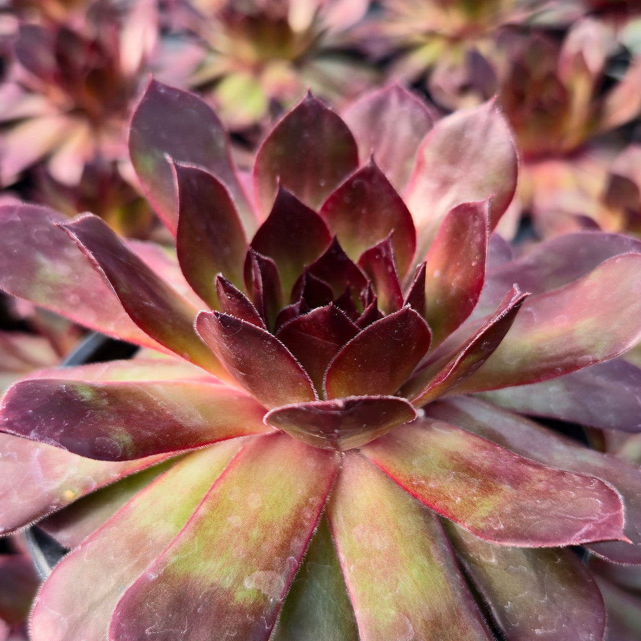 Chick Charms® Giant Copper Canyon™ (PPAF): A copper red rosette with hints of lime green. Its long leaves make it a great centerpiece in a cold garden. In shadier conditions, the plant becomes greener while the sun brings out its more red colors. This plant is fully rooted in a 4.5" pot.
