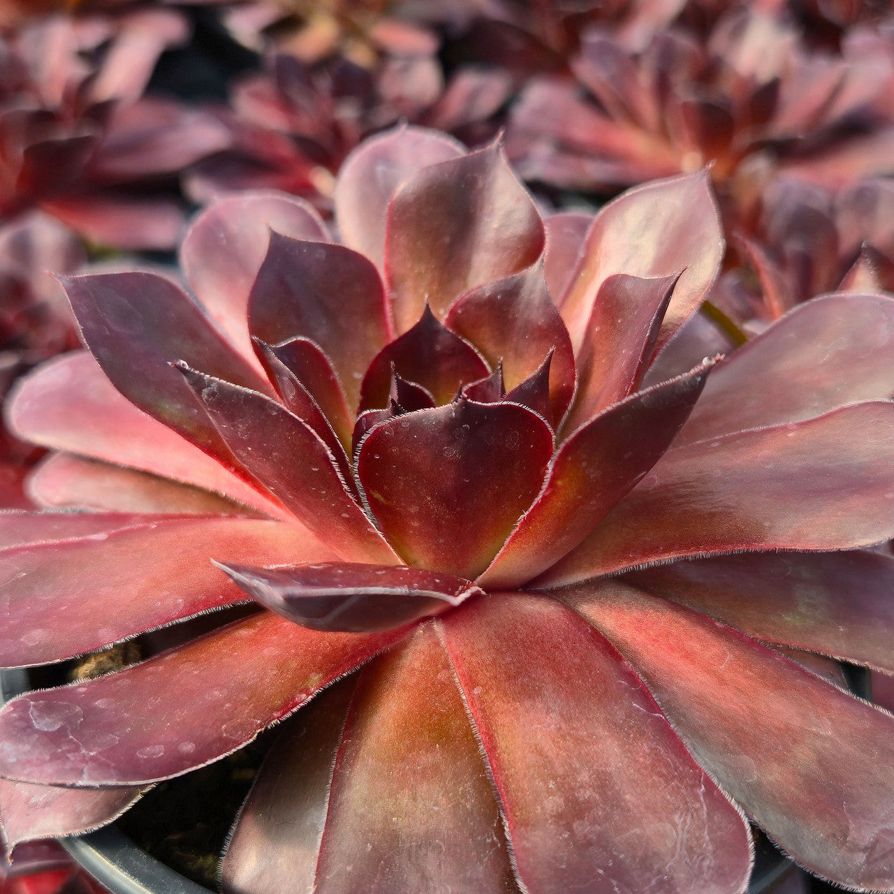 Chick Charms® Maroon Mountain™ (PPAF) features rich maroon rosettes with pale watermarks on the backs of the leaves, adding subtle detail and contrast. Its larger form and deep color make it a striking centerpiece for rock gardens, containers, and sunny borders. This cold-hardy Sempervivum will gradually produce offsets, forming a beautiful cluster over time. Each plant is fully rooted in a 4.5" pot.