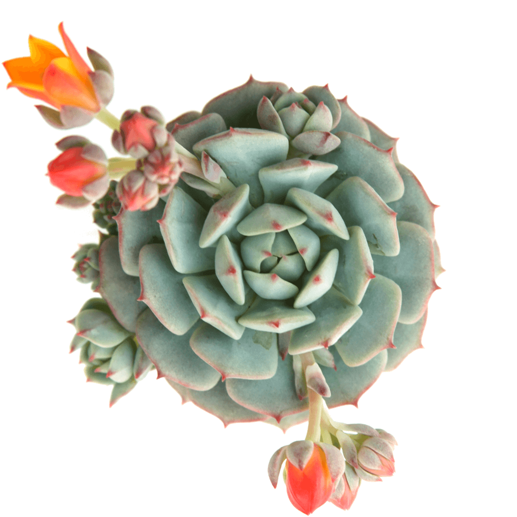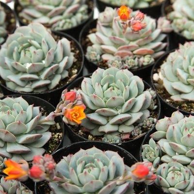 One of the more petite Echeveria, 'Painted Lady' succulents form small rosettes with fleshy, silvery-blue leaves and pink tips. While a single rosette of this pastel-colored Echeveria only grows to about 3-4 inches wide, their propensity to offset, or multiply, very rapidly can lead to beautiful clusters of plants up to 3 feet in width! In the springtime, golden yellow flowers with orange “painted” tips will emerge on stalks a few inches taller than the rosettes themselves.