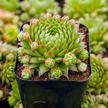 Sempervivum globiferum subsp. preissianum is a charming and hardy alpine succulent known for its tightly clustered, lime-green rosettes and its unique method of propagation—by producing small, round, detachable "chicks" that roll away from the parent, giving it the nickname "roller hen and chicks." Native to mountainous regions of Central and Eastern Europe, this subspecies thrives in rocky, well-drained soils and is exceptionally cold-hardy, enduring frost and snow with ease. Its symmetrical, softly hairy rosettes are compact and dense, making it perfect for rock gardens, alpine troughs, or crevice plantings. With minimal care requirements and excellent drought tolerance, S. globiferum subsp. preissianum is an ideal choice for gardeners seeking both resilience and botanical charm.